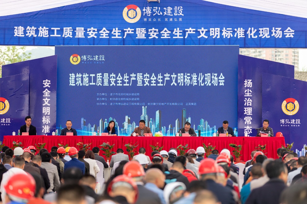 4月11日,由遂寧市住房和城鄉(xiāng)建設(shè)局主辦,射洪縣住房和城鄉(xiāng)建設(shè)局協(xié)辦的“2019年全市建筑施工質(zhì)量安全生產(chǎn)暨安全生產(chǎn)文明施工標(biāo)準(zhǔn)化觀摩會”,由射洪馨寧公司開發(fā)、遂寧市博弘建設(shè)工程有限公司(以下簡稱博弘建司)承建的“正黃·金域香江”項目施工現(xiàn)場順利召開。遂寧市住建局黨委書記敬茂軍、射洪縣副縣長鄒清、射洪縣住建局局長王彬、遂寧市質(zhì)量安全監(jiān)督站站長周杰等相關(guān)領(lǐng)導(dǎo)親臨現(xiàn)場并做重要講話,全市二級以上施工單位共700多名同行參加了此次觀摩會。