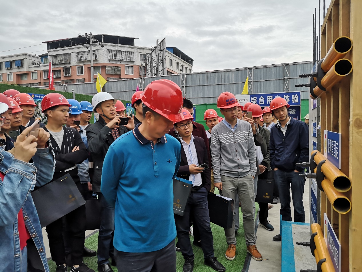 觀摩現(xiàn)場的安全體驗、綜合用電體驗等,用現(xiàn)場場景渲染,時刻提醒現(xiàn)場人員“安全第一”; 觀摩現(xiàn)場亮點不勝枚舉:如材料堆碼、機具配置、主體施工、砌體施工、防水處理、構(gòu)造柱施工工藝等?!霸瓉硭麄兊匿摻z繩結(jié)是這樣纏繞的!”“防塵處理很不錯嘛!”……在隨后的現(xiàn)場觀摩中,來自各企業(yè)700多名建筑施工人員有序參觀了金域香江項目的施工現(xiàn)場,一邊拍照一邊討論,感慨良多,收獲滿滿。