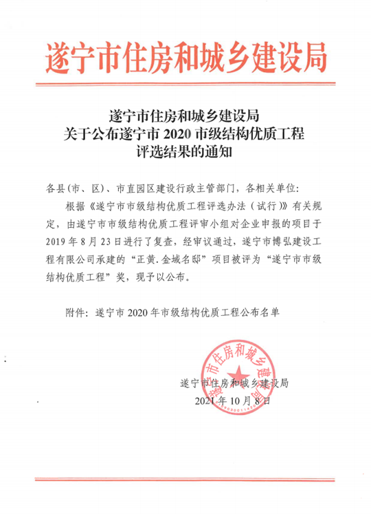 恭喜遂寧“正黃·金域名邸”項目被評為“遂寧市2020市級結(jié)構(gòu)優(yōu)質(zhì)工程”獎稱號。